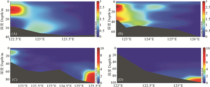 图 3 夏季东海水体中DMHg(pg/L)在D2-D5(A)、P1-F5(B)、P1-P6(C)和W1-W4(D)断面的垂直分布 Fig. 3 Vertical distribution of DMHg (pg/L) at sections of D2-D5 (A), P1-F5 (B), P1-P6 (C) and W1-W4 (D) in East China Sea water in summer |