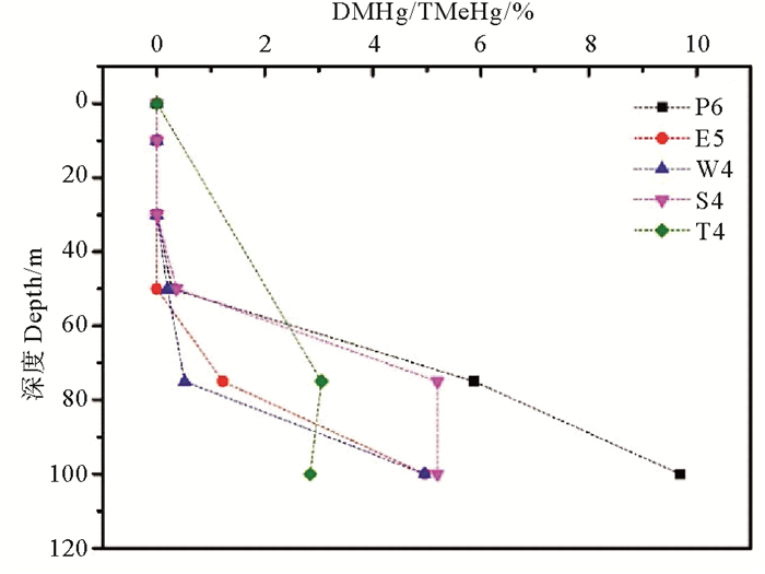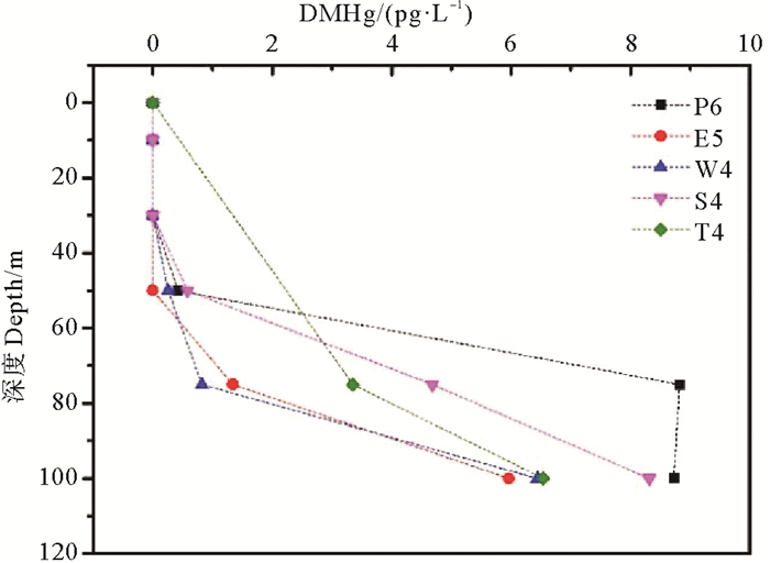 本研究进一步选取了采集区域靠近外海的5个站位(P6、E5、W4、S4、T4)来探索海水中DMHg浓度的垂直变化特征(见图 4)。结果表明,在水深小于50 m时,DMHg均未检出; 随着水深的增加,东海外海站位水体中DMHg浓度明显上升,检出区域主要集中在75 m层和底层海水中。研究表明,在光照或者存在氧化剂(·OH)的条件下,水体中的DMHg易被氧化而降解生成MMHg[36],这与本研究中东海表层水DMHg较低的检出率相吻合。