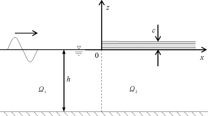整个流体区域划分成2个子区域:左侧的开放水体区域Ω1(x≤0,-h≤z≤0)和夹芯板覆盖的水体区域Ω2(0≤x,-h≤z≤0)。流体的速度势满足拉普拉斯方程和以下边界条件: