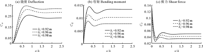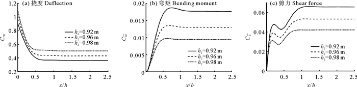 图 5给出端部自由状态下3种不同夹芯板的无因次挠度、弯矩和剪力,无因次波数k0h=6。夹芯板挠度随着芯材厚度的增大逐渐减小,这主要是因为夹芯板的整体刚度增大;面板厚度的变化不影响挠度最大值所对应的位置,3种不同夹芯板的挠度均在端点处达到最大值;随着离端点距离的增加,夹芯板的挠度先减小,然后趋于稳定,这是因为此时流体区域仅存在向右传播的传播波;随着芯材厚度的增加,夹芯梁的弯矩和剪力均逐渐增大。图 6给出端部简支状态下三种不同夹芯板的无因次挠度、弯矩和剪力,计算条件与图 5中的参数一致。芯材厚度影响与端部自由状态时相同,不过,端部简支约束使挠度最大值不再出现在夹芯板左端(此处挠度和弯矩均为0),而且挠度响应最大值明显减小。