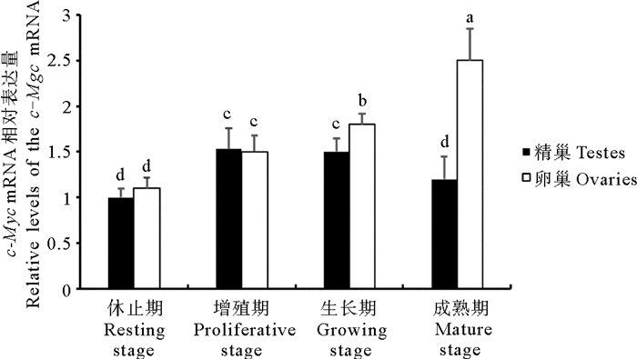 (所有数据均为平均值±标准误(n=3);休止期精巢中的c-Myc mRNA水平设为标准1,其它数值均为与其的倍数表示。不同字母表示各组数据间存在显著性差异(P<0.05)。Data are indicated as the mean±SEM from three independent samples which are detected in duplicate. The expression level in the testes at resting stage is set as 1.00 to calibrate the relative levels in gonads at other stages. Different letters indicate significant differences from each other (P<0.05).) 图 1 栉孔扇贝不同发育时期精巢和卵巢中的c-Myc mRNA相对表达量 Fig. 1 Relative levels of the c-Myc mRNA in C. farreri testes and ovaries at different stages |