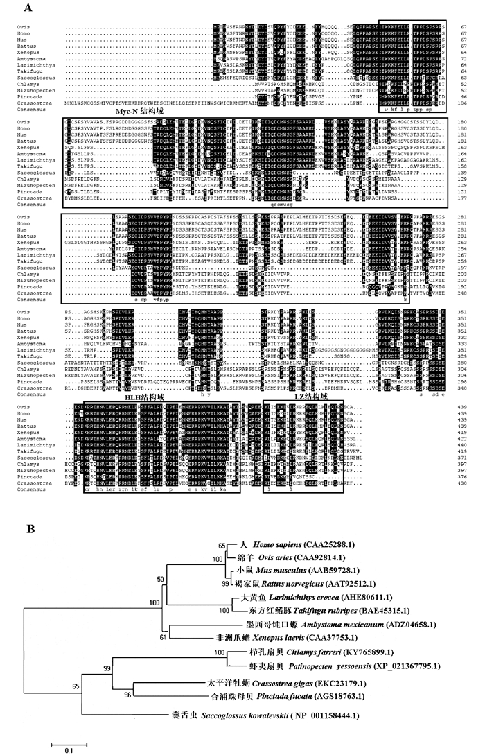 2 结果 2.1 栉孔扇贝c-Myc全长cDNA及其序列特征本文获得的栉孔扇贝c-Myc cDNA全长为2 943 bp(GenBank序列号:KY765899.1),其中开放阅读框为1 194 bp,共编码397个氨基酸;5’非翻译区为103 bp,3’非翻译区为1 646 bp,含有24 bp的poly(A)尾巴。BLAST分析结果显示,栉孔扇贝c-MYC氨基酸序列与已知的其他物种c-MYC序列均有同源性,其中与虾夷扇贝(Patinopecten yessoensis)一致性最高,为97%,与太平洋牡蛎(Crassostrea gigas)的一致性为50%,与合浦珠母贝(Pinctada fucata)的一致性为48%,但与脊椎动物的一致性较低,例如与非洲爪蟾(Xenopus laevis)和人(H. sapiens)的一致性均为29%。多序列比对结果显示,该预测蛋白序列既具有MYC家族所特有的保守结构域,包括羧基末端的螺旋转角螺旋结构域(HLH)和亮氨酸拉链(LZ),同时还具有c-MYC蛋白所特有的Myc-N转录激活区(见图 2A)。根据系统进化树可知,栉孔扇贝的c-MYC蛋白首先与虾夷扇贝、合浦珠母贝和太平洋牡蛎聚为一枝,进而与囊舌虫(Saccoglossus kowalevskii)等作为无脊椎动物聚为一类,最后与脊椎动物聚类。栉孔扇贝c-MYC的系统进化与经典的物种进化地位基本一致(见图 2B)。