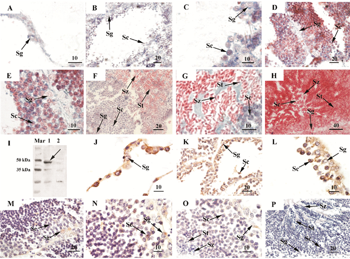 Western blot结果显示,栉孔扇贝重组c-MYC蛋白制备的多克隆抗体在成熟期精巢中检测出一条特异性条带,其分子量与栉孔扇贝c-MYC蛋白的理论值(45 kDa)大小基本一致(见图 3 I)。使用重组c-MYC蛋白制备的多克隆抗体(见图 3 I)进行免疫组织化学检测,结果显示栉孔扇贝c-MYC蛋白在不同发育时期性腺中的细胞学定位(见图 3 J~P和图 4 I~P)与原位杂交结果基本一致(见图 3 A~H和图 4 A~H)。