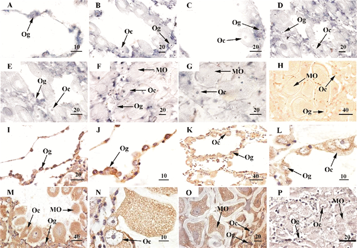 (A~G,反义探针的原位杂交,其中蓝色为阳性信号;A:休止期;B:增殖期;D:生长期;F:成熟期;C、E和G分别为B、D和F的局部放大图;H,正义探针的原位杂交(阴性对照)。I-P,c-MYC多克隆抗体的免疫组织化学,其中棕色为阳性信号;I,休止期;K,增殖期;M,生长期;O,成熟期;J、L和N分别为I、K和M的局部放大图;P,免疫前血清的免疫组织化学(阴性对照)。Og:卵原细胞;Oc:卵母细胞;MO:成熟卵。标尺:μm。A~G, in situ hybridization with the antisense probe, positive signals are indicated in blue; A, resting stage; B, proliferative stage; D, growing stage; F, mature stage; C, E and G, the magnified images of B, D and F, respectively; H, in situ hybridization with sense probe (negative control). I-P, immunohistochemistry with anti-c-MYC polyclonal antibody, positive signals are indicated in brown; I, resting stage; K, proliferative stage; M, growing stage; O, mature stage; J, L and N, the magnified images of I, K and M, respectively; P, immunohistochemistry with preimmunue serum (negative control). Og, oogonium; Oc, oocyte; MO, mature oocyte. Scalar bar, μm.) 图 4 栉孔扇贝c-Myc mRNA和c-MYC蛋白在卵巢中的细胞学定位 Fig. 4 Localization of c-Myc mRNA and c-MYC protein in C. farreri ovary demonstrated by in situ hybridization and immunohistochemistry |