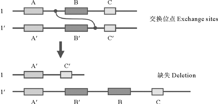 图 1 缺失变异产生的主要来源:不等互换 Fig. 1 The main generation source of deletion variation: Unequal crossing over |