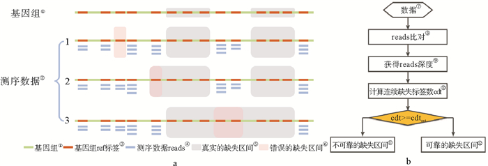 (①Genome; ②Sequencing data; ③Ref tags of genome; ④Reads of sequencing data; ⑤Real deletion regions; ⑥False deletion regions; ⑦Data; ⑧Reads mapping; ⑨Reads depth; ⑩Calculate continuous deletion tags; B11 Unrelible decetion regions; B12 Reliable decetion regions.a.基因组中真实缺失区域在测序数据中可能会出现的3种情况;b.检测缺失区间的流程。a.The three cases of the real deletion regions in the genome may appear in the sequencing data; b.Process for detecting deletion regions.) 图 2 缺失片段的鉴定原理和处理流程 Fig. 2 The identification principle and process flow of deletion regions |