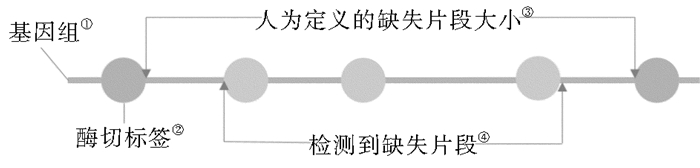 (①Genome; ②Restriction digestion tags; ③Artifically specificed deletion region size; ④Detected deletion region) 图 3 缺失片段大小的计算 Fig. 3 Calculation of deletion regions'size |