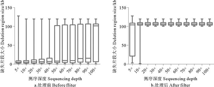 从表 1中可以看出,未处理时,测序深度越浅,数据量越少,大部分标签未被测到,导致了较高的缺失片段检测的错误率,如5×、10×时,其错误率高达90%以上。当测序深度增大时,检测到的缺失片段数目逐渐趋近于真实缺失片段数,错误率有所降低,但当测序深度达到100×时错误率仍高达45%以上。这说明直接将连续无reads比对的ref标签所在区域视为缺失区域,会带来很高的错误率。