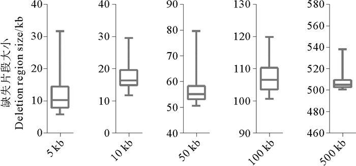 图 5 20×测序数据cdt≥3时检测出的缺失片段大小的变化范围 Fig. 5 Size distribution of detected deletion regions at 20×sequencing depth with cdt≥3 |