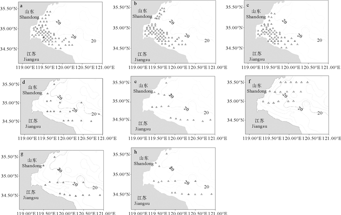 (a—c:2013年5—6月;d:2015年5月;e:2017年4月、2018年5月;f:2017年5月上旬;g:2017年5月下旬;h:2017年6月、2018年6月。a—c: May—June, 2013; d: May, 2015; e: April, 2017 and May, 2018; f: Early May, 2017; g: Late May, 2017; h: June, 2017 and June, 2018.) 图 1 调查航次与站位分布 Fig. 1 Survey cruises and stations distribution |