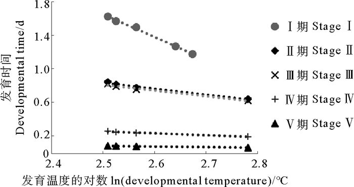 | $ Ⅰ期:y=-2.69x+8.67;\\ Ⅱ期:y=-0.71x+2.60;\\ Ⅲ期:y=-0.69x+2.53;\\ Ⅳ期:y=-0.22x+0.80;\\ Ⅴ期:y=-0.07x+0.26。$ | (5) |