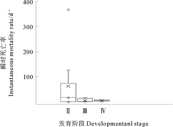 小黄鱼Ⅱ期卵子瞬时死亡率在16.43~364.24 d-1范围变化,平均93.50 d-1,其中部分航次死亡概率超过0.90,导致所求瞬时死亡率较高超过100 d-1;Ⅲ期卵子瞬时死亡率0.09~16.94 d-1,平均5.66 d-1;Ⅳ期卵子瞬时死亡率3.18~7.31 d-1,平均4.83 d-1,详见图 5。调查中未发现Ⅴ期卵子,该阶段卵子自然死亡情况未进行评估。