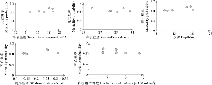 图 6 小黄鱼Ⅱ期卵子死亡概率及栖息地环境 Fig. 6 Mortality probability and habitat environmental characteristics of stage Ⅱ eggs of small yellow croaker |
