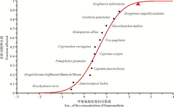( 三角标记代表毛蚶数据。Datum of S. subcrenata was presented by triangle. ) 图 1 甲氰菊酯的水生生物物种敏感度分布曲线 Fig. 1 Sensitivity distribution curve of aquatic species for fenpropathrin |