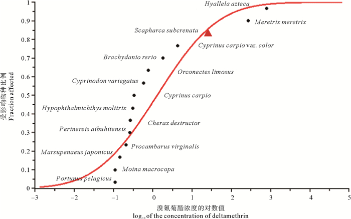 ( 三角标记代表毛蚶数据。Datum of S. subcrenata was presented by triangle. ) 图 2 溴氰菊酯的水生生物物种敏感度分布曲线 Fig. 2 Sensitivity distribution curve of aquatic species for deltamethrin |