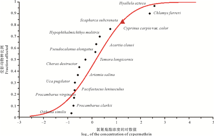 ( 三角标记代表毛蚶数据。Datum of S. subcrenata was presented by triangle. ) 图 3 氯氰菊酯的水生生物物种敏感度分布曲线 Fig. 3 Sensitivity distribution curve of aquatic species for cypermethrin |