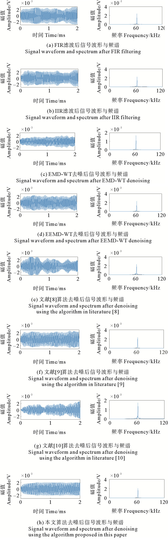 (((a)FIR滤波Finite Impulse Response filter;(b)IIR滤波Infinite Impulse Response filter;(c)EMD-WT;(d)EEMD-WT;(e)文献[8]算法The algorithm in literature[8];(f)文献[9]算法The algorithm in literature[9];(g)文献[10]算法The algorithm in literature[10];(h)本文算法The algorithm proposed in this paper.)) 图 8 八种不同算法去噪效果 Fig. 8 Denoising effects of eight different algorithms |