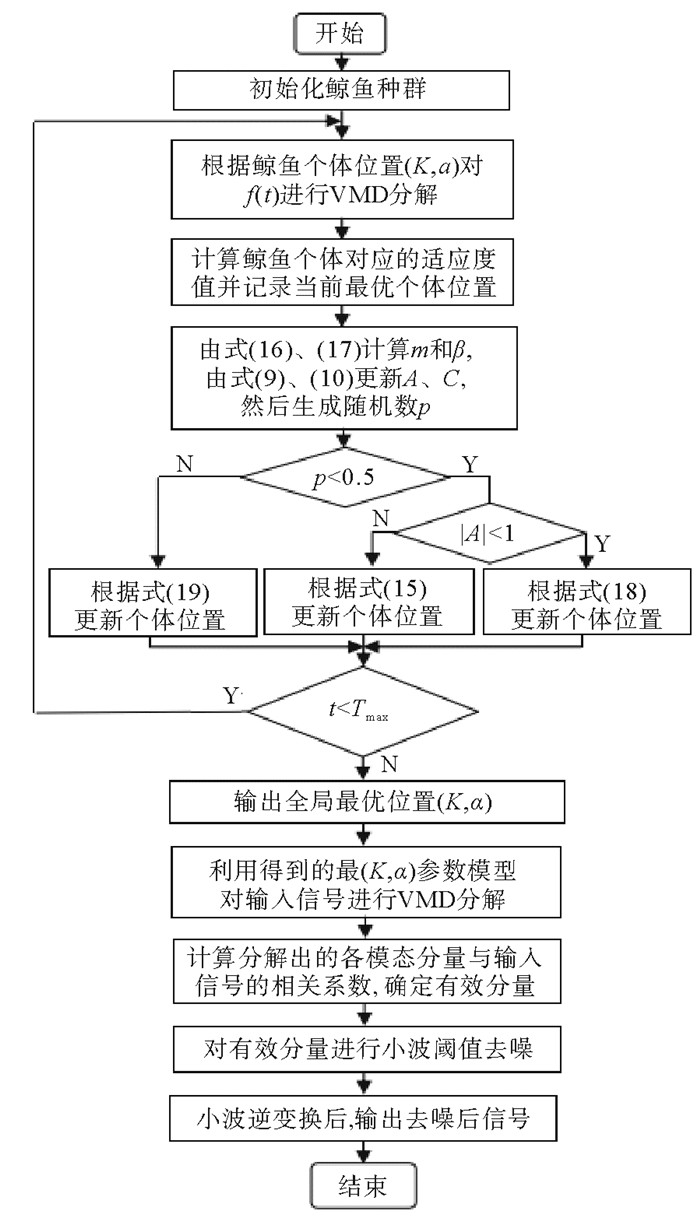 4 基于改进WOA-VMD的小波阈值去噪使用VMD分解信号时需要预先设定参数:分解模态个数K和惩罚因子α。本文利用鲸鱼优化算法选取最佳[K, α]参数组合,选取功率谱熵作为WOA的适应度函数,假设在第t次迭代过程中,输入信号f(t)被分解出K个模态分量,则功率谱熵的计算公式如下: