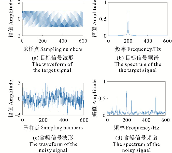 式中:仿真信号f(t)代表含噪输入信号;由各谐波分量与高斯白噪声组成;x0(t)代表目标信号,主频为200 Hz;x1(t)、x2(t)、x3(t)和x4(t)分别表示频率为50、100、250和500 Hz的干扰信号;n(t)代表高斯白噪声。设置采样频率为2 000 Hz,采样点数为1 024,当含噪信号的信噪比为-2.975 0 dB时,仿真信号及其对应的频谱如图 4所示,原始信号包含明显的频率干扰和噪声。