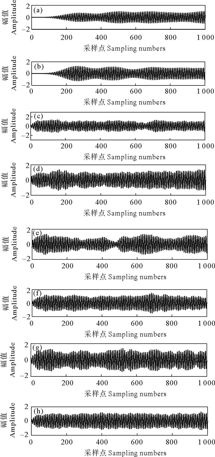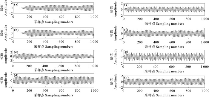 (((a)FIR滤波Finite Impulse Response filter;(b)IIR滤波Infinite Impulse Response filter;(c)EMD-WT;(d)EEMD-WT;(e)文献[8]算法The algorithm in literature[8];(f)文献[9]算法The algorithm in literature[9];(g)文献[10]算法The algorithm in literature[10];(h)本文算法The algorithm proposed in this paper.)) 图 7 不同算法去噪效果 Fig. 7 Denoising effects of different algorithms |
