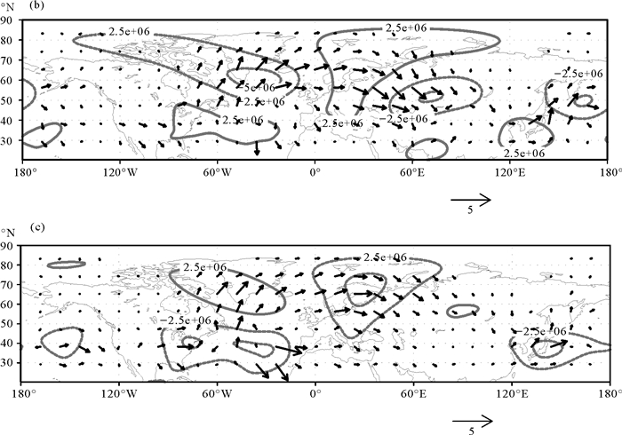 图 10(b)、(c) PC2典型正(负)位相下的T-N波作用量(箭头)及对应的准地转流函数(等值线) Fig. 10(b)、(c) T-N wave activity flux(arrow) and its corresponding quasi-geostrophic steam function(contour) in PC2 positive/negative phase |