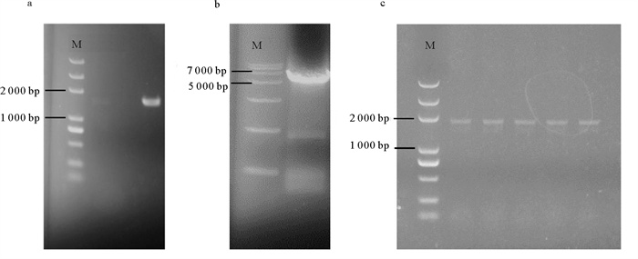 ( a:目的片段核酸电泳结果;b:载体核酸电泳结果;c:阳性克隆验证结果。a: Results of fragment nucleic acid electrophoresis; b: Results of carrier nucleic acid electrophoresis; c: Results of positive clones verification. ) 图 2 pET-28a(+)-OUC-FARS6重组质粒的PCR扩增及阳性克隆验证结果 Fig. 2 Results of PCR amplification and positive clone verification for recombinant plasmid pET-28a(+)-OUC-FARS6 |