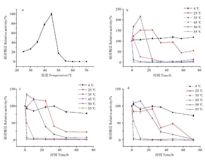 将上述纯化后的酶液与pH=9.0 50 mmol/L Glycine-NaOH缓冲液混合,置于4、25、35、45、50和55 ℃分别孵育0、2、10、24、36、48、60和72 h后,加入底物p NPS溶液后反应90 min,最后加入1 mol/L NaOH终止反应,测定OD410 nm,确定该酶在各温度下的稳定性,具体测定方法如1.2.5中所述。