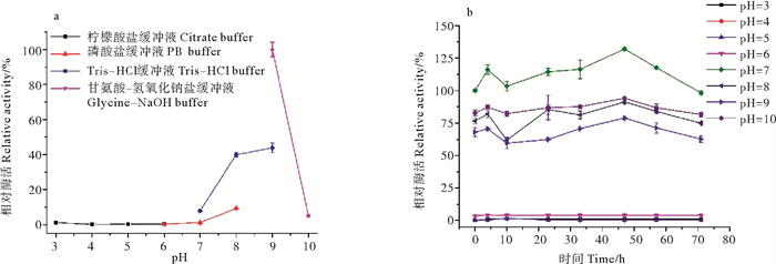 ( a:最适pH的研究;b:不同pH缓冲液对OUC-FARS6酶活稳定性的影响。a: Effects of pH on the activity of OUC-FARS6; b: Effects of pH on the stability of OUC-FARS6 in different pH buffers. ) 图 5 最适pH和pH对OUC-FARS6酶活稳定性的影响 Fig. 5 Effects of pH on the activity and stability of OUC-FARS6 |