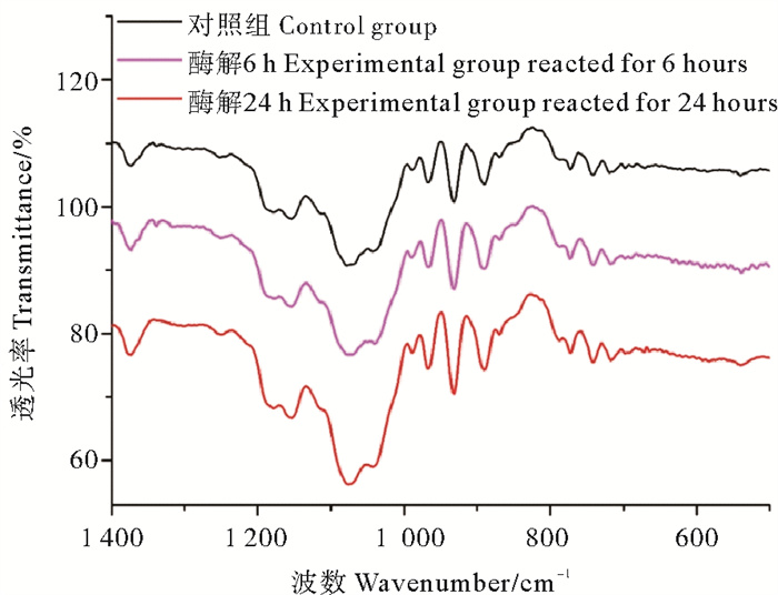 查阅文献[18]得出,850 cm-1处的吸收峰表示4-硫酸基-D-半乳糖C4位上存在硫酸基。由FT-IR的结果(见图 7)可知,芳基硫酸酯酶酶解琼胶6 h组和24 h组在850 cm-1处峰值减小,表明OUC-FARS6可用于脱除琼胶4-硫酸基-D-半乳糖C4位上的硫酸基。但由于所使用的琼胶原料本身的含硫量较低(0.66%),同时加酶量较低,反应条件还需优化等问题,使得峰值变化不是特别明显,脱除效果有待提升,经芳基硫酸酯酶酶解琼胶24 h后脱硫率仅为15.6%。