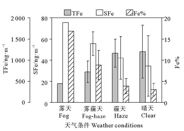 图 1 不同天气条件下PM2.5中TFe和SFe浓度及Fe溶解度(Fe%) Fig. 1 TFe and SFe concentrations and Fe solubility (Fe%) in PM2.5 under different weather conditions |
