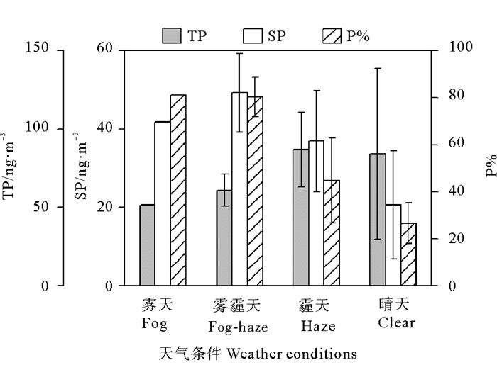 图 2 青岛不同天气条件下PM2.5中TP和SP浓度及P溶解度(P%) Fig. 2 TP and SP concentrations and P solubility (P%) in PM2.5 under different weather conditions in Qingdao |