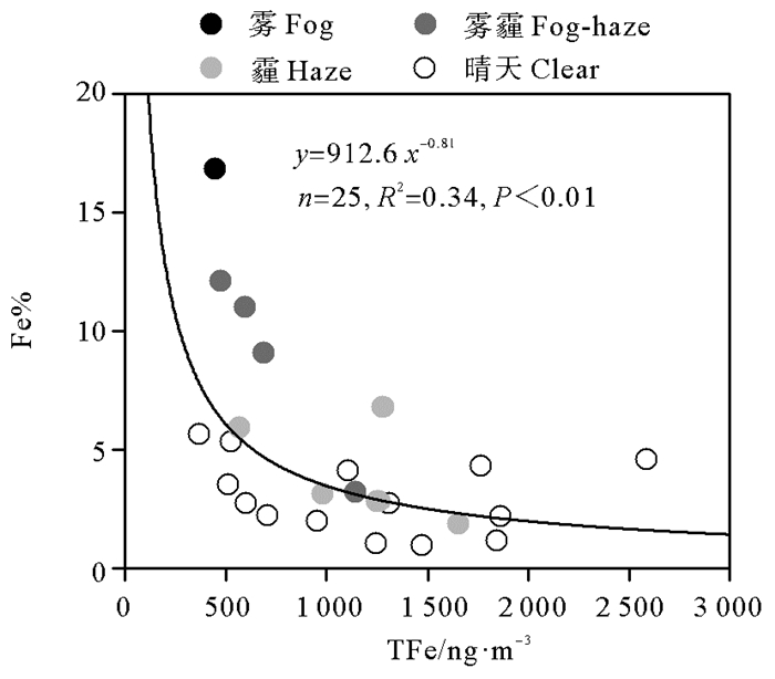 2.3 影响青岛PM2.5中Fe和P溶解度的因素 2.3.1 TFe和TP负载PM2.5中Fe溶解度与TFe之间存在显著的负指数幂函数关系(见图 3),这种关系在全球很多区域的TSP样品中普遍存在,被看作为具有低TFe负载和高Fe溶解度的人为源颗粒与具有高TFe负载和低Fe溶解度的矿物沙尘源颗粒两个端元的混合[5, 32]。比较不同天气下二者之间的关系,发现雾天和雾霾天数据点基本分布在人为源端,且多数位于拟合曲线之上,晴天的数据点较为分散,基本位于拟合曲线之下,表明雾霾天时较高的Fe溶解度除两个端元混合颗粒初始溶解度的贡献外,还受到其他因素影响。由Fe溶解度和TFe的拟合曲线可以看到,沙尘源端Fe溶解度约为1.5%,表明青岛细颗粒矿物沙尘中Fe溶解度约为1.5%,这与我国西部沙尘源区气溶胶中0.28%~4.1%的Fe溶解度较一致[33]。