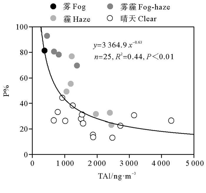 图 4 青岛不同天气条件下PM2.5中P溶解度(P%)和TAl的关系 Fig. 4 Relationship of P solubility (P%) with TAl in PM2.5under different weather conditions in Qingdao |