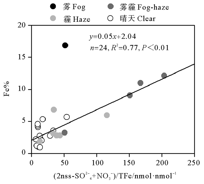 大气酸化过程是气溶胶传输过程中提升气溶胶中Fe溶解度的主要机制[14-15]。分析Fe溶解度与气溶胶中含量最多的酸组分nss-SO42-和NO3-的关系,结果显示,Fe溶解度与两种酸组分均具有显著相关关系(见表 1),因此合并两种酸组分进行后续讨论。酸组分与TFe的摩尔浓度比被定义为气溶胶Fe的酸化程度,是反映大气酸化过程对Fe溶解度影响的有效指标[34]。分析Fe溶解度与(2nss-SO42-+NO3-)/TFe的关系,发现除雾天外,二者呈显著线性相关关系(见图 5),拟合方程的截距为2.04,表明未受到大气酸化过程影响的PM2.5中Fe初始溶解度约为2.0%,这与前文估计的青岛细颗粒矿物沙尘中1.5%的Fe溶解度基本一致。