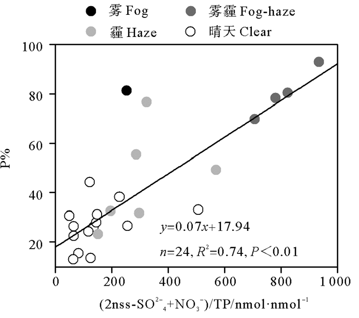 不同天气条件下P溶解度与(2nss-SO42-+NO3-)/TP的关系与Fe相似,雾霾天时(2nss-SO42-+NO3-)/TP最高,为(810.9±82.2) nmol·nmol-1,霾天和雾天次之,分别为(303.4±133.2) nmol·nmol-1和251.2 nmol·nmol-1,晴天最低,为(149.7±114.6) nmol·nmol-1。尽管雾天的(2nss-SO42-+NO3-)/TP略低于霾天,但P溶解度却显著高于霾天,约为霾天的1.8倍,表明除酸化程度外,P溶解度还受到其他因素控制。
