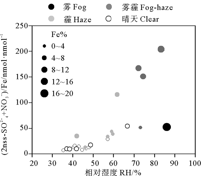 对比分析不同天气下Fe溶解度与酸化程度的关系,发现雾霾天的(2nss-SO42-+NO3-)/TFe最高,晴天时最低,平均分别为(143.3±56.6)和(17.5±12.5)nmol·nmol-1,这是雾霾天最高的酸组分浓度和较低的TFe浓度、晴天时最低的酸组分浓度和最高的TFe浓度带来的必然结果。雾天时(2nss-SO42-+NO3-)/TFe为52.0 nmol·nmol-1,与霾天的(46.5±32.4)nmol·nmol-1基本相当,但雾天的溶解度却显著高于霾天;霾天时(2nss-SO42-+NO3-)/TFe明显高于晴天,但霾天的Fe溶解度与晴天的基本相当。这些结果表明除了酸化程度之外,还有其他因素控制Fe溶解度。