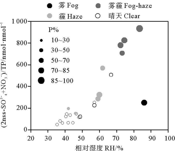 分析P溶解度与RH和(2nss-SO42-+NO3-)/TP的关系,发现当RH < 60%,无论酸化程度高低,P溶解度基本低于30%,当RH>60%,P溶解度均在30%以上,当RH>70%,溶解度均在50%以上(见图 8)。霾天时,RH接近60%的两个数据点的P溶解度为65%左右,这两个样品的酸化程度略高于雾天,但雾天时P溶解度(81%)明显高于这两个霾天样品,其原因可能是雾天明显高于潮解点的RH更有利于P的酸化溶解。雾霾天时RH为70%~85%,随着RH和(2nss-SO42-+NO3-)/TP的增强,P溶解度显著提升。雾天时的RH与雾霾天接近,酸化程度明显低于雾霾天样品,但是P溶解度却仍然达到81%,与Fe相似,这可能暗示了雾天的特殊天气过程显著促进气溶胶中不溶态P的酸化溶解。