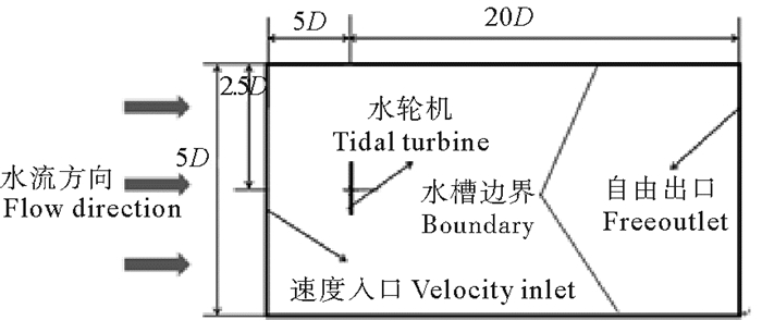 水轮机的计算区域如图 3所示。水轮机中心距离入口为5D处,既提高了计算效率,节省了计算时间,同时又保证了计算准确性;为避免计算域上下边界对水轮机的干扰,选取上下边界距离水轮机中心2.5D;考虑尾流在水轮机后方大约20D处完全恢复,故出口边界在水轮机中心后方25D处[9]。