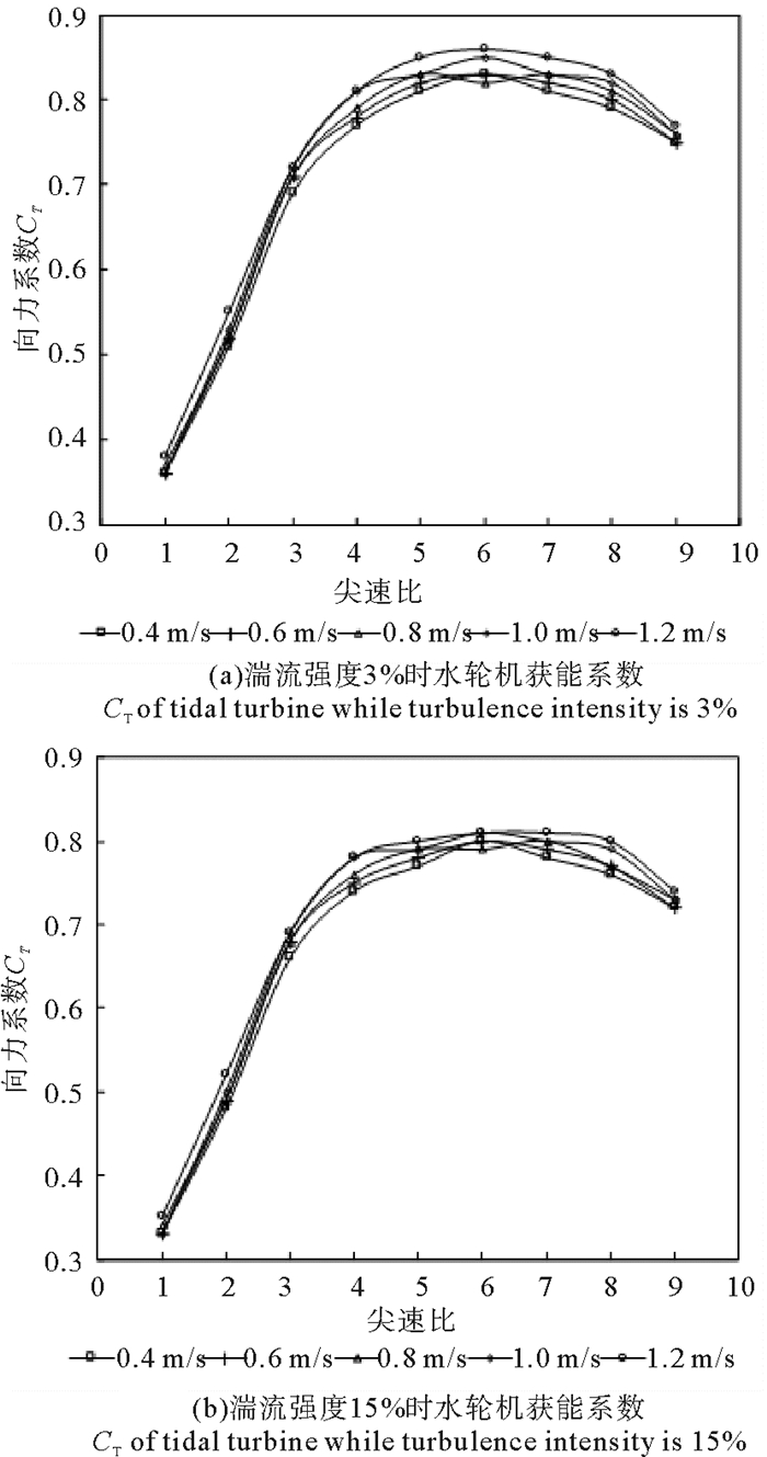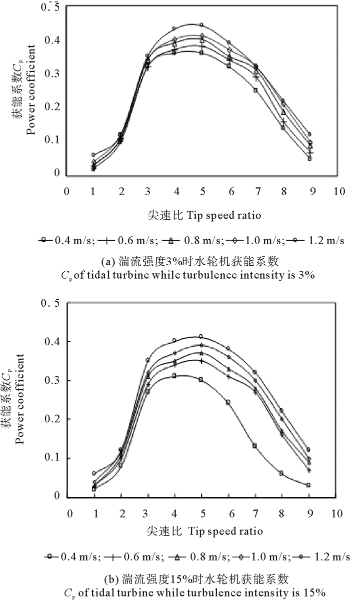 如图 4所示,对两种湍流强度,当尖速比在3~6时水轮机获能系数较高;湍流强度为3%时各曲线更接近一条曲线,而湍流强度为15%时各曲线比较分散;对应每种来流速度下,湍流强度为3%时水轮机获能系数略高于湍流强度为15%时;获能系数随来流速度的增大而有所增加,来流速度为1.2 m/s时最大获能系数比来流速度为0.4 m/s时最大获能系数高10%左右。
