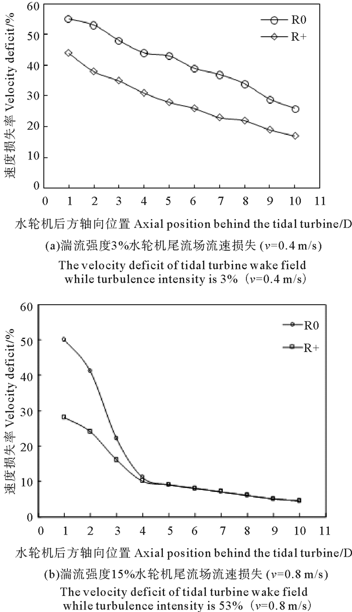 如图 8所示,相同来流速度时,湍流强度不同,流过水轮机后尾流场湍流强度也不同,且湍流强度越大,尾流场轴向和径向影响范围越大。