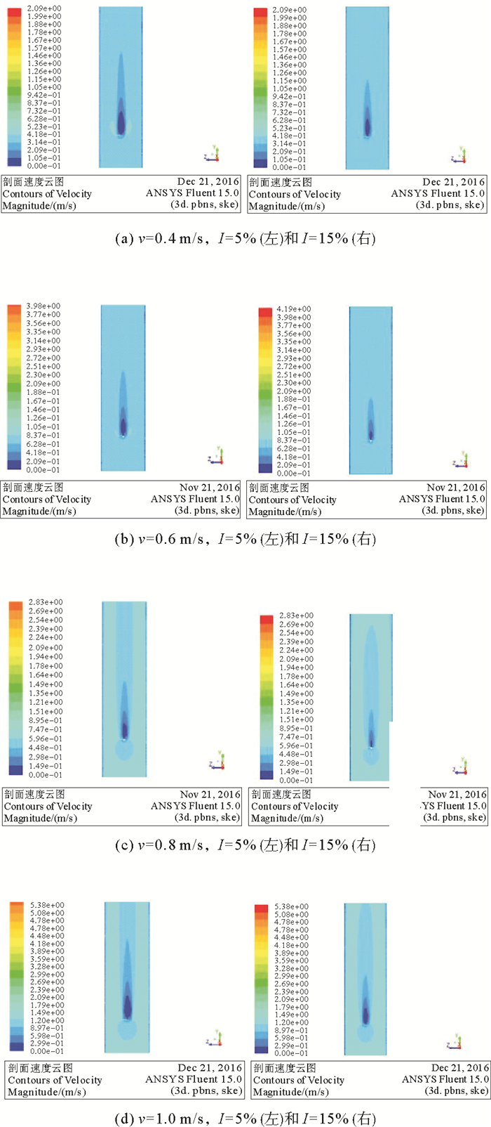 数值仿真中得到了相同来流速度下,不同湍流强度时水轮机后方尾流场速度云图及湍流强度云图,如图 7、8所示。