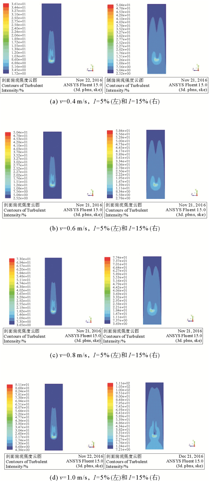 式中:I-湍流强度;σ-平方差;u-x方向水流速度(m·s-1);v-y方向水流速度(m·s-1);w-z方向水流速度(m·s-1)。