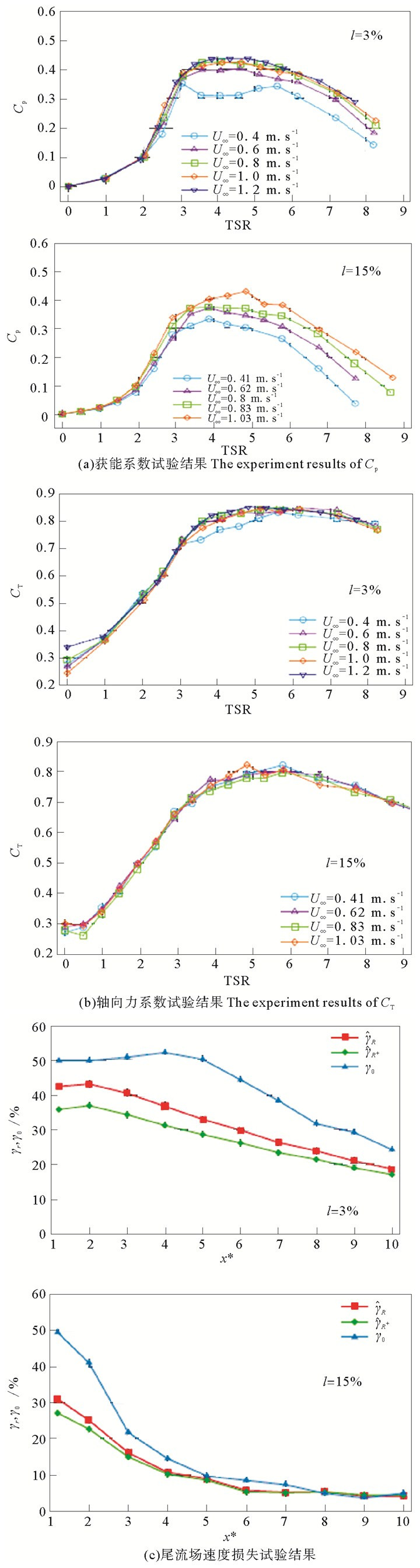 (1) 当来流速度相同时,湍流强度越大,水轮机获能系数越小;当湍流强度相同时,来流速度越大,获能系数越高。当存在湍流时,水轮机的获能效率降低,获能系数最大可降低10%左右。