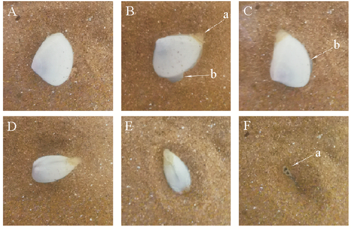(A:潜沙准备期; B:伸出水管及斧足; C:斧足插入沙子中; D:竖壳; E:潜沙; F:潜沙结束期; a:水管; b:斧足。A: Preparation; B: Stretching siphons and foot; C: Foot drilling into the sand; D: Stacking shell; E: Burrowing into sand; F: Terminal; a: Siphons; b: Foot. ) 图 1 侏儒蛤的潜沙过程 Fig. 1 Burrowing process of M. lateralis |