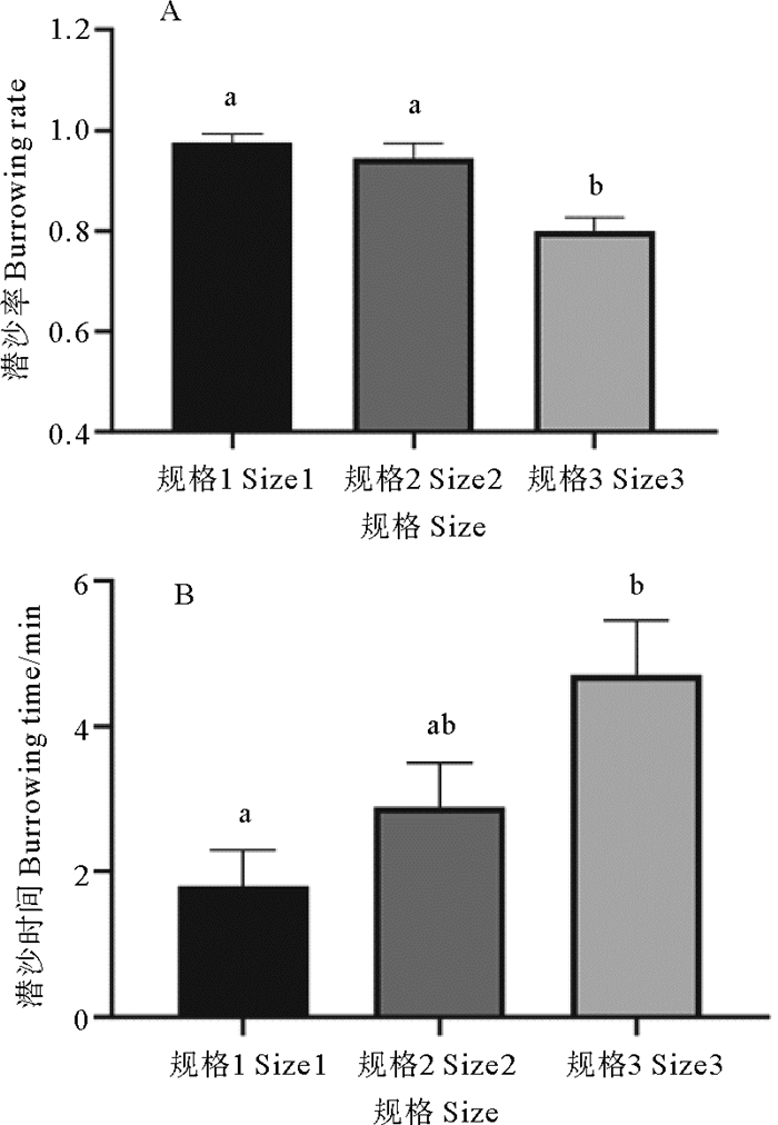 (A:潜沙率; B:潜沙时间; 不同字母代表不同实验组间存在显著差异(p < 0.05)。A: Burrowing rate; B: Burrowing time; Means with different letters are significantly different (p < 0.05). ) 图 2 不同规格侏儒蛤的潜沙行为 Fig. 2 Effect of different size on the burrowing behavior of M. lateralis |