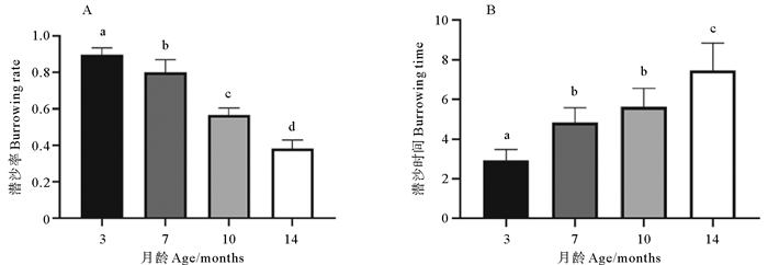 (A:潜沙率; B:潜沙时间; 不同字母代表不同实验组间存在显著差异(p < 0.05)。A: Burrowing rate; B: Burrowing time; Means with different letters are significantly different (p < 0.05). ) 图 3 不同月龄侏儒蛤的潜沙行为 Fig. 3 Effect of different age on the burrowing behavior of M. lateralis |
