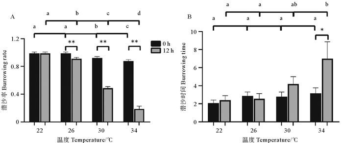 高温对侏儒蛤潜沙行为具有显著的影响。如图 4A所示,在0 h实验组中,侏儒蛤在22 ℃条件下的潜沙率为98.8%,在26 ℃的潜沙率为98.8%,显著高于在30℃的92.2%以及34 ℃的87.7%(p < 0.05);在12 h实验组中,侏儒蛤在22 ℃条件下的潜沙率为98.8%,在26 ℃的潜沙率为91.1%,显著高于在30 ℃的48.8%以及34 ℃的18.8%(p < 0.05)。通过比较相同温度不同时间的实验结果,在22 ℃条件下0与12 h侏儒蛤潜沙率保持不变,在26、30和34 ℃下生存12 h侏儒蛤潜沙率均显著低于0 h侏儒蛤潜沙率(p < 0.05)。如图 4B所示,在0 h实验组中,侏儒蛤在22 ℃条件下的潜沙时间为(2.06±0.33) min,在26 ℃的潜沙时间为(2.86±0.44) min,在30 ℃的潜沙时间为(2.78±0.5) min,在34 ℃的潜沙时间为(3.14±0.6) min,其潜沙时间并没有显著差异;在12 h实验组中,侏儒蛤在22 ℃条件下的潜沙时间为(2.4±0.49) min,在26 ℃条件下的潜沙时间为(2.55±0.55) min,在30 ℃条件下的潜沙时间为(4.2±0.77)min,显著低于34 ℃条件下的(7±1.7) min(p < 0.05),侏儒蛤在34 ℃条件下的潜沙所耗费的时间显著增加(p < 0.05)。实验结果表明,侏儒蛤的潜沙能力随着环境温度的升高而逐渐减弱,主要表现为潜沙率降低和潜沙时间增长,并且随着高温时间的延长,其潜沙能力受到的影响进一步加剧。