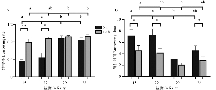 (A:潜沙率; B:潜沙时间; 不同字母代表不同实验组间存在显著差异(*p < 0.05, **p < 0.01)。A: Burrowing rate; B: Burrowing time; Means with different letters are significantly different (*p < 0.05, **p < 0.01). ) 图 5 不同盐度对侏儒蛤潜沙行为的影响 Fig. 5 Effect of different salinity on the burrowing behavior of M. lateralis |