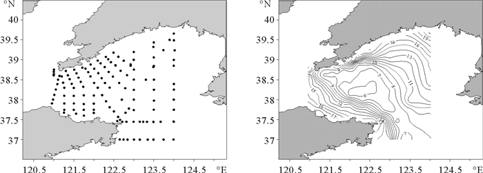 基于北黄海冷水团分布范围变化相对较小的特点,本文选取北黄海作为取水区域,并假定北黄海各年份冷水团分布范围变化不大。为调查北黄海冷水团的分布情况,选取北黄海908项目调查的20个断面、120个站位大范围观测数据进行分析,调查时间为2006年7月20日—8月7日,调查范围涵盖了渤海海峡至124°E的北黄海绝大部分海域。观测站位与所得底层温度分布如图 1所示。