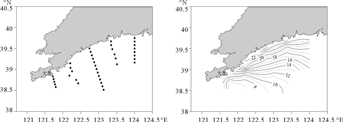 2.2.1 辽南海域搜集北黄海夏季沿岸流及冷水团界面变化补充调查与研究项目在辽南海域进行了5个断面的温度调查数据,调查时间为8月上旬,调查站位设置及海域底层水温分布如图 3所示。